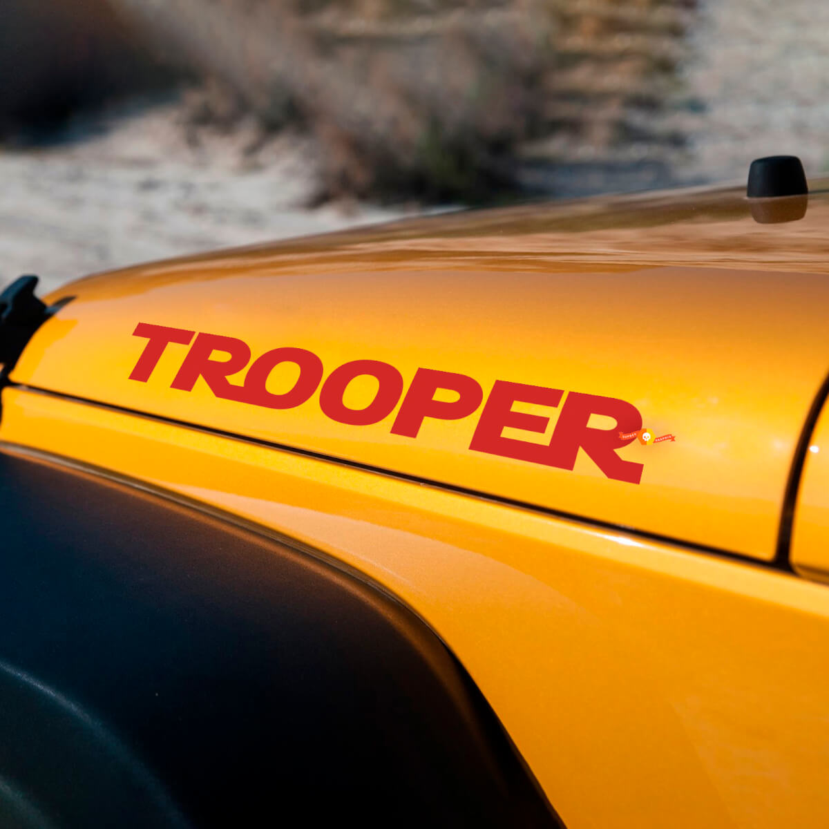 Rüsten Sie Ihren Jeep Wrangler mit dem Trooper Hood Decal Sticker auf und setzen Sie ein Statement auf der Straße. Bestellen Sie jetzt und genießen Sie weltweiten Versand in die USA, Kanada und Europa!