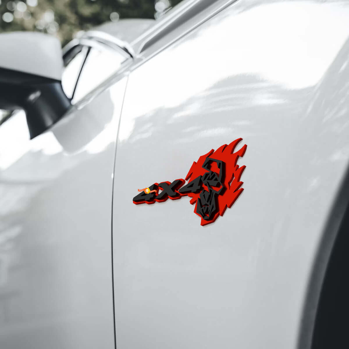 Verbessern Sie den Stil Ihres Fahrzeugs mit den Flame Skull 4x4 Kotflügel-Emblemen. Dieses markante 3D-Heckklappen-Emblem verleiht Ihrem Truck oder SUV einen wilden und kraftvollen Look – ideal für Offroad-Enthusiasten.