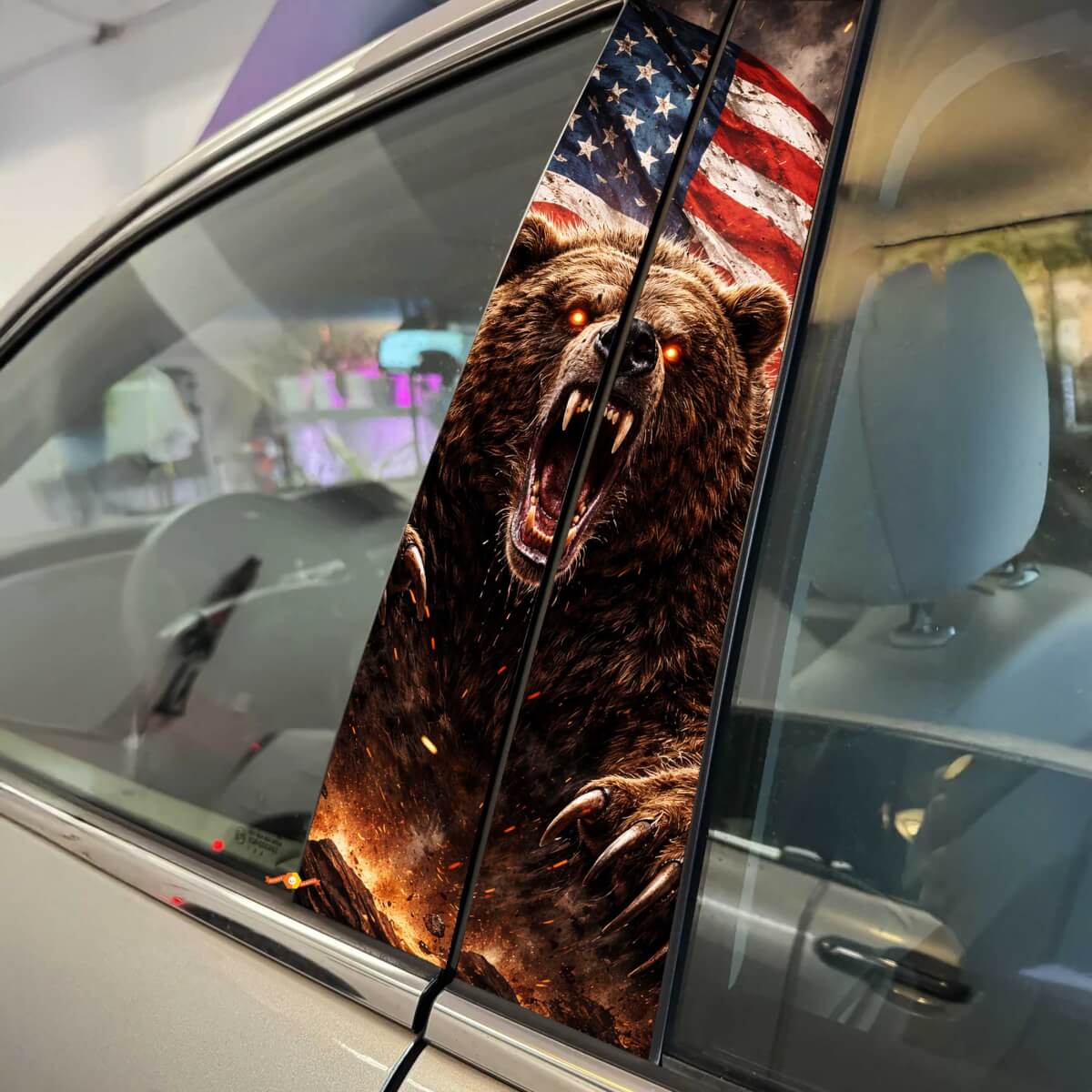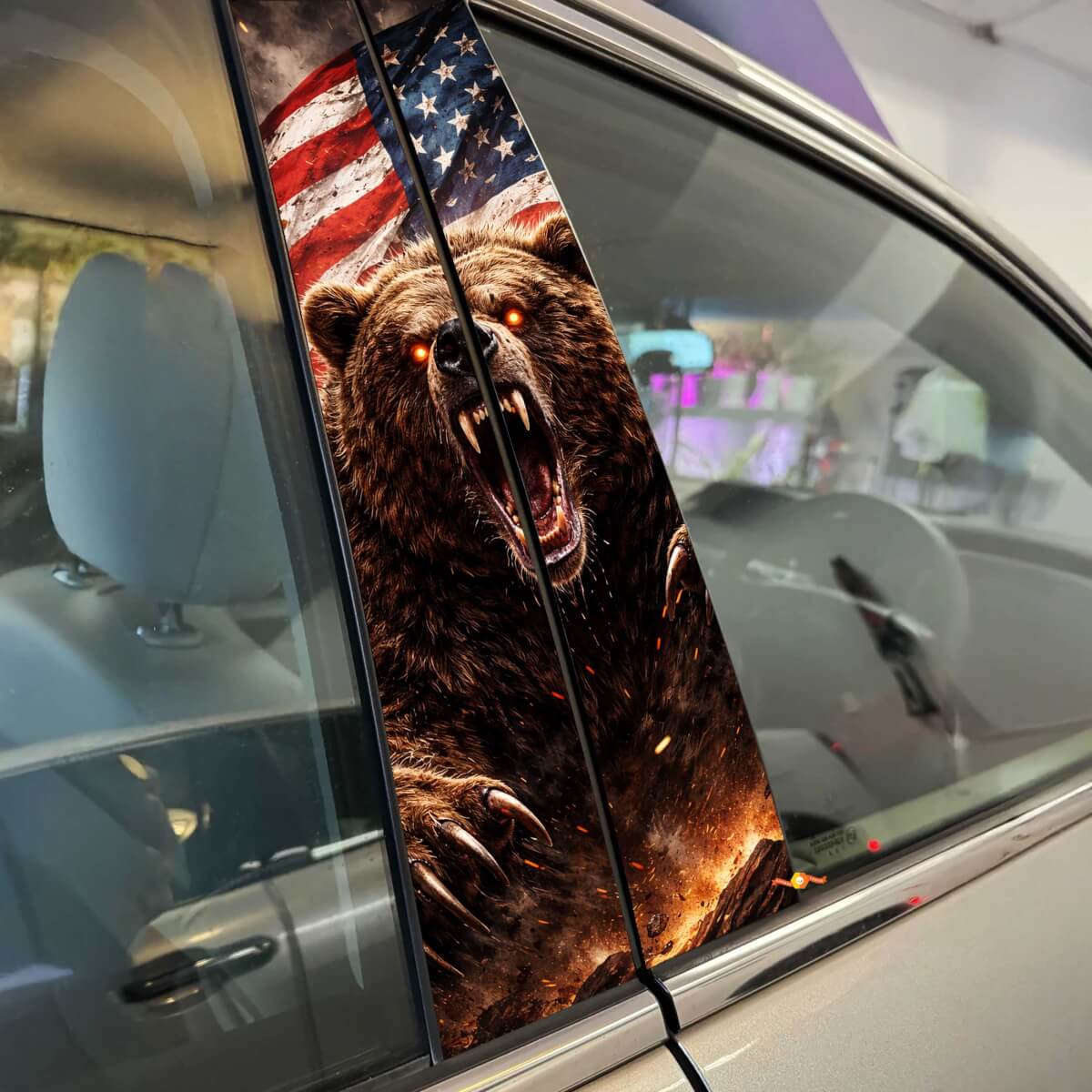 Verbessern Sie das Aussehen Ihres Fahrzeugs mit dem Bear Rage American Flag Pillar Doors Vinyl-Aufkleber. Dieses auffällige Design zeigt ein kraftvolles Bärenbild kombiniert mit der ikonischen amerikanischen Flagge, perfekt, um Ihren Patriotismus und Ihre kühne Persönlichkeit an den Säulentüren Ihres Autos zu präsentieren.