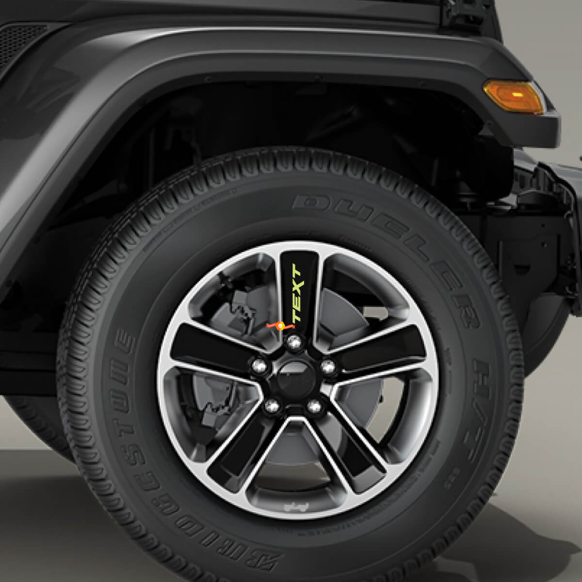 Verleihen Sie Ihrem Jeep mit unserem Custom Text Wheel Vinyl Decal Stickers Set eine einzigartige Note. Speziell für Jeep-Felgen entwickelt, sind diese Aufkleber langlebig, wetterbeständig und einfach anzubringen, sodass Ihr Fahrzeug auf der Straße hervorsticht.