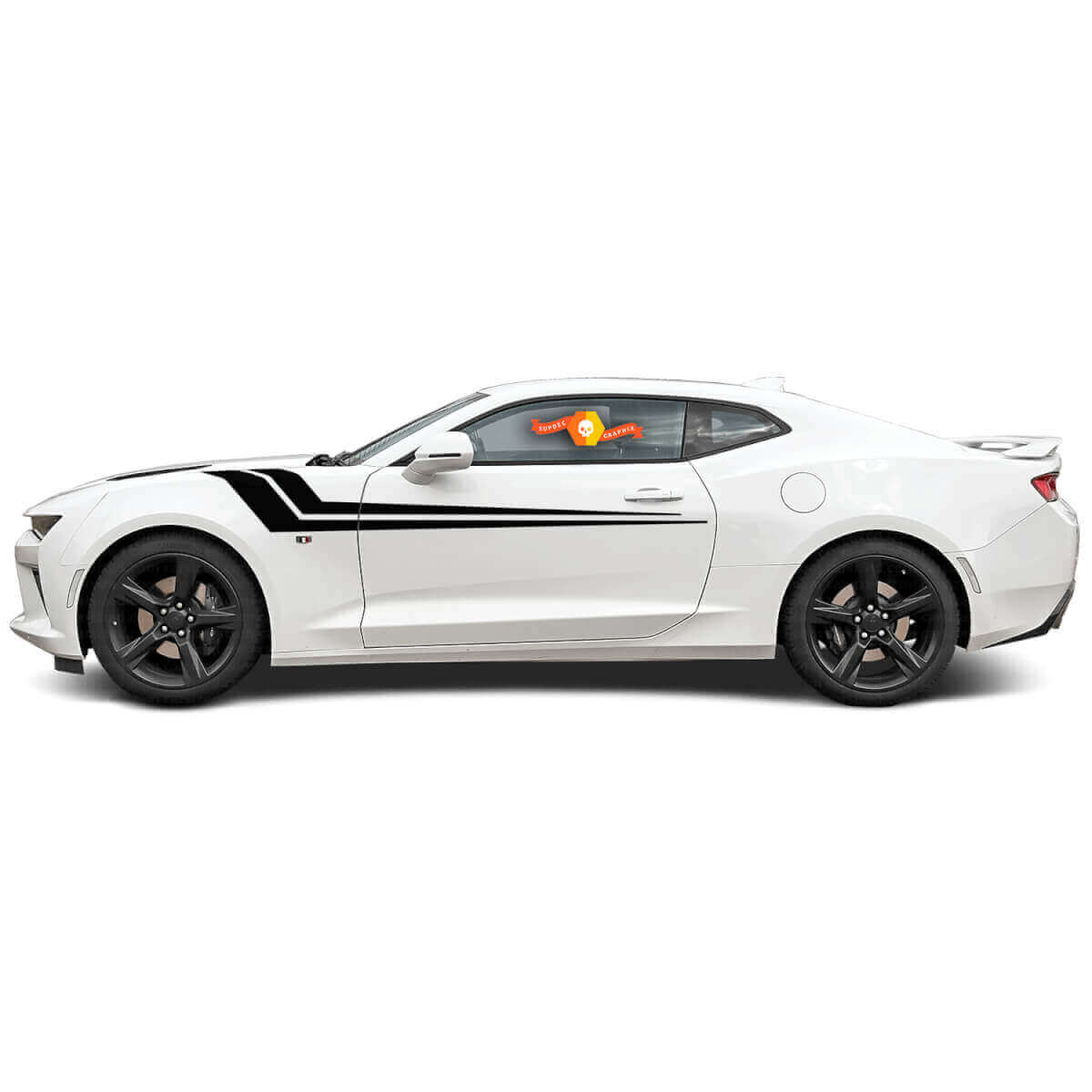 Die originale und einzige Gelegenheit gibt es nur auf unserer Website für Vinyl-Autodekorationen für alle Automodelle! Wir präsentieren Ihnen den originalen Aufkleber für den vorderen Kotflügel zur Montage an einem Chevrolet Camaro. Der Vinylaufkleber ist aus hochwertigem Vinylmaterial gefertigt und wird näher am vorderen Kotflügel angebracht. Der Camaro-Karosserieaufkleber besteht aus zwei schrägen Streifen, die an der Motorhaube beginnen, sich biegen und sanft entlang der Autotüren verlaufen und bis zum Heck reichen. Dieses Design schafft einen dynamischen und sportlichen Look und betont die Linien Ihres Camaro.