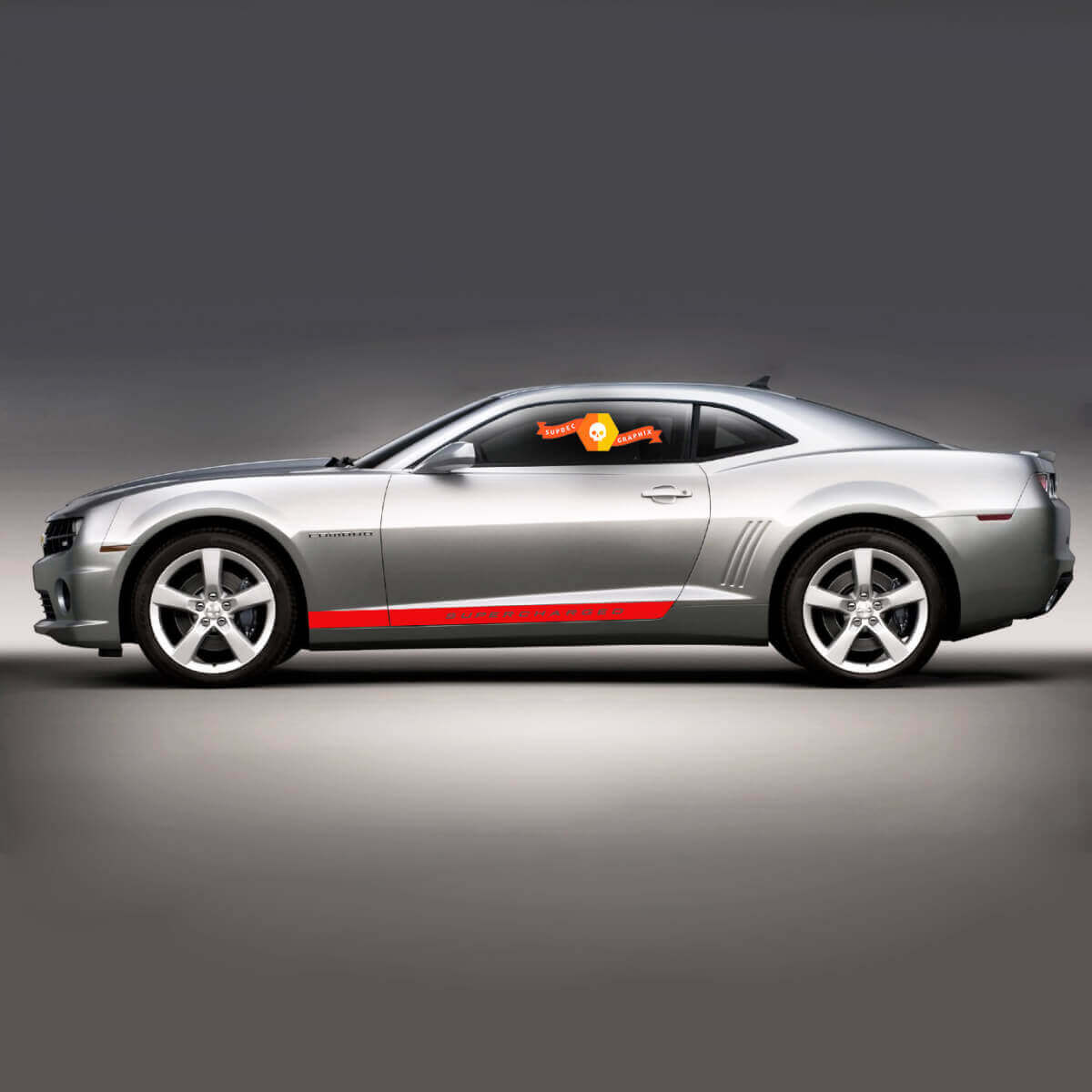 Verwandeln Sie die Seitenteile Ihres Chevrolet Camaro mit einem langen Streifen für die Schweller, der mit der Aufschrift „Supercharged“ dekoriert ist. Dieser stilvolle Streifen verleiht Ihrem Auto einen aggressiven und kraftvollen Look, unterstreicht seinen sportlichen Charakter und verbessert sein Erscheinungsbild.